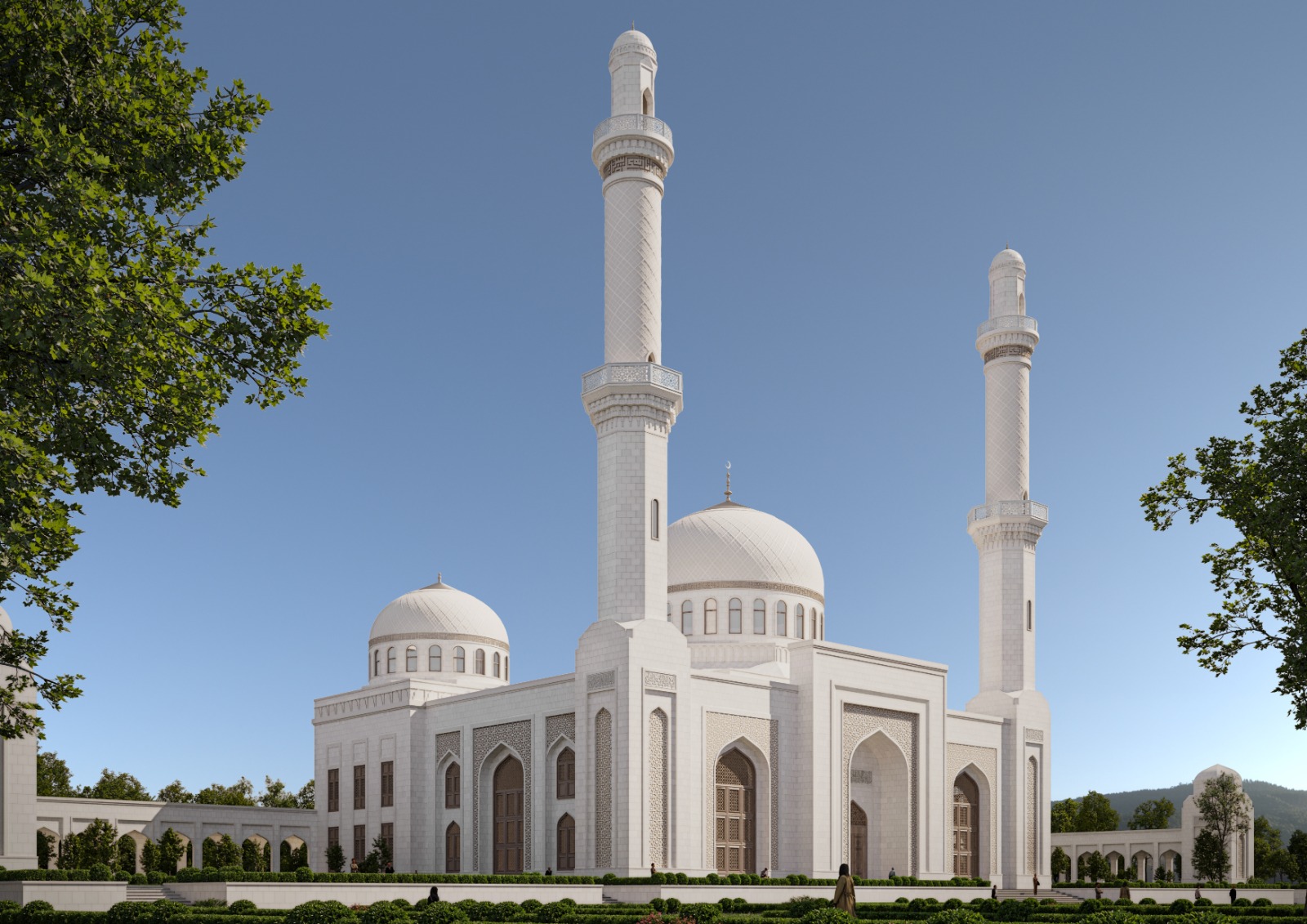 During the development of the master plan, harmony with the surrounding environment and proper integration with nearby residential buildings, a church, and public facilities were carefully considered. The overall appearance of the mosque reflects a combination of traditional Islamic architectural features and modern design solutions. Facades incorporating tile decorations, marble cladding, and wooden lattice elements form the main visual identity of the project